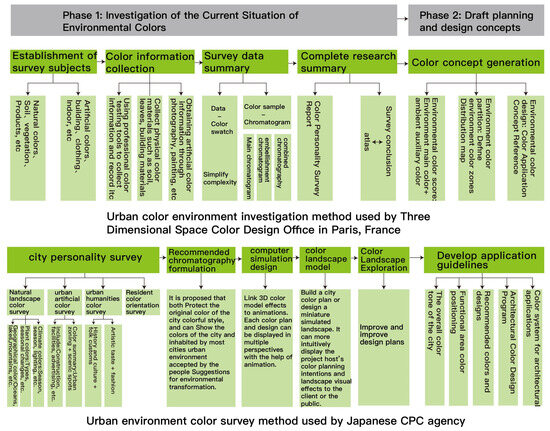 Color, possessing the flexible and transient capability to respond to both the continuity and multiple demands of urban spatial characteristics, offers a potential way to coexist between the needs for continuity and renewal [28]. Yifeng Xin [29] argued that there are primarily two international approaches to the investigation of environmental color, as illustrated in Figure 1. Each method has its unique characteristics. The environmental color investigation method represented by Jean-Philippe Lenclos from France focuses more on color analysis and induction after the survey, thereby generating color concepts. The CPC agency color investigation method from Japan emphasizes practical application, providing strategies for specific environmental color planning. Both approaches consider the influence of the geographical environment on color, but they differ in their operational focus—one emphasizes the impact of the landscape’s geographical environment on color, while the other concentrates on the categorization of urban environmental colors.