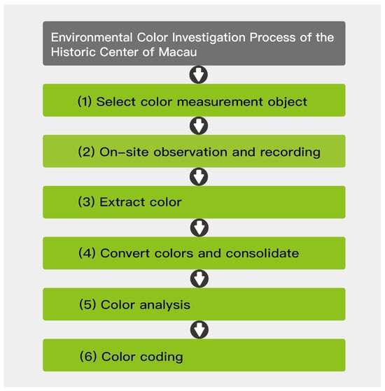 The environmental color investigation primarily involves the on-site color extraction, color measurement, photographic documentation, and subsequent unified analysis of color values for buildings, squares, streets, landscapes, and major public facilities within the designated research scope of the Historic Center of Macau. This process extracts characteristic colors that can represent the distinctive features of the Historic Center of Macau. This study focused on the experiences gained from color planning and Jean-Philippe Lenclos’s color geography, on one hand, and on the other, it concentrated on the diverse and varied experiences developed from the concepts and practices in the current conditions of the Historic Center of Macau. Through the detailed investigation procedure, the main information about the historic district environment was derived, thereby constructing the color system of the Historic Center of Macau and formulating strategies for the preservation of related historical heritage. The survey process established based on the motives and purposes of this study is illustrated in Figure 3.