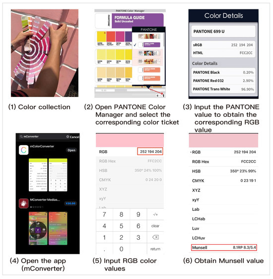 The main color measurement tools in this study include the PANTONE color chart and color extraction devices. The PANTONE color chart only indicates the ink mixing values of colors and cannot be used directly for research. Therefore, the first step was to convert the PANTONE color chart values into corresponding RGB values through software. The specific operation involved using the software developed by PANTONE (The Classic Software to Manage Pantone Color Libraries in Adobe®, Sku#: DWNLD-PS-CM100), selecting the specified color swatch within the program, and finding the electronic color code corresponding to the values on the paper color chart to obtain the corresponding RGB values as standards. Then, these RGB color values were converted into Munsell values through the mobile app (mConverter). The specific steps are illustrated in Figure 4.