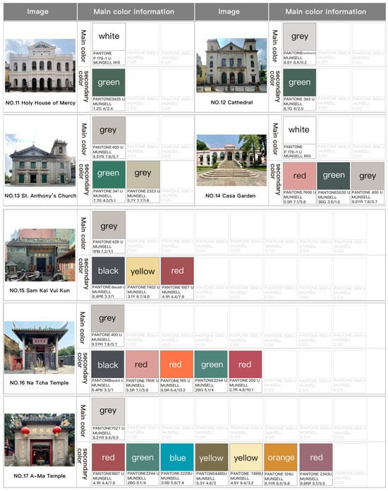 The architectural color survey of the Historic Center of Macau in this study primarily encompassed 19 buildings, including 14 Western-style buildings and 5 Chinese-style buildings, with specific color information illustrated in Figure 5.