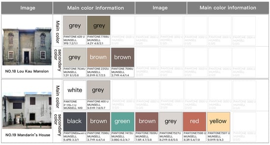 This study’s architectural color analysis of the Historic Center of Macau summarized 19 buildings, from which a total of 75 colors were extracted, including 21 main colors and 54 secondary colors.