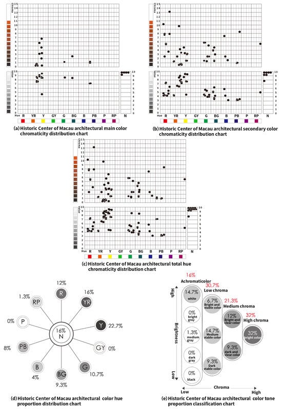 The main colors of the architectural colors in the Historic Center of Macau mainly came from the exterior facades of buildings, with the color range concentrated in the hues of YR (Yellow–Red), Y (Yellow), G (Green), BG (Blue–Green), PB (Purple–Blue), and N (Achromatic). The secondary colors were primarily derived from architectural elements, such as doors, windows, railings, and exterior wall decorations, with the color range focused on R (Red), YR (Yellow–Red), Y (Yellow), G (Green), BG (Blue–Green), B (Blue), PB (Purple–Blue), RP (Red–Purple), and N (Achromatic). Combining the main and secondary colors formed a comprehensive chromaticity chart, concentrating the color range in the hues of R (Red), YR (Yellow–Red), Y (Yellow), G (Green), BG (Blue–Green), B (Blue), PB (Purple–Blue), RP (Red–Purple), and N (Achromatic). The largest proportion of colors consisted of Y (Yellow) at 22.7%, N (Achromatic) at 16%, and YR (Yellow–Red) at 16%, followed by R (Red), G (Green), BG (Blue–Green), PB (Purple–Blue), B (Blue), and RP (Red–Purple). The overall color tone was predominantly high-chroma and bright colors, making up 32%, mainly including bright colors, medium stable colors, and white, followed by bright clear colors, dark clear colors, dark stable colors, bright stable colors, and medium grey. Details are shown in Figure 6.
