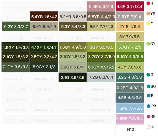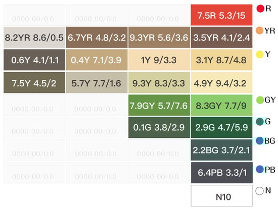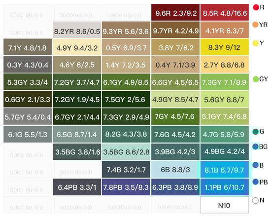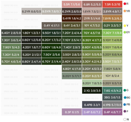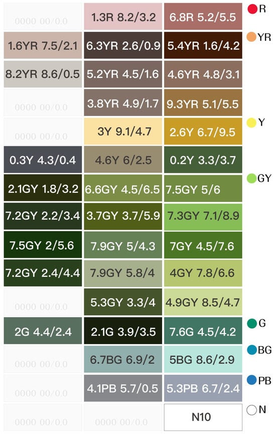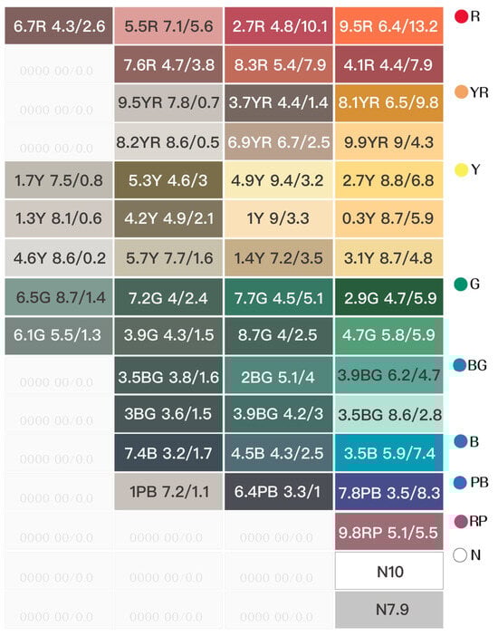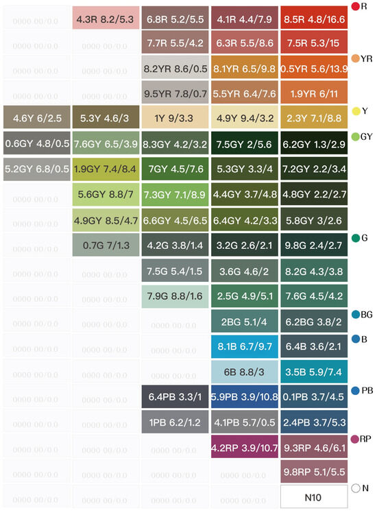 The color-coding work was primarily based on the induction method of the Munsell color system, following the sequence of hues and the classification of tones: R (Red), RY (Red-Yellow), Y (Yellow), GY (Green-Yellow), G (Green), BG (Blue–Green), B (Blue), BP (Blue–Purple), P (Purple), RP (Red–Purple), and N (Achromatic colors), thereby establishing a conceptualized color atlas.