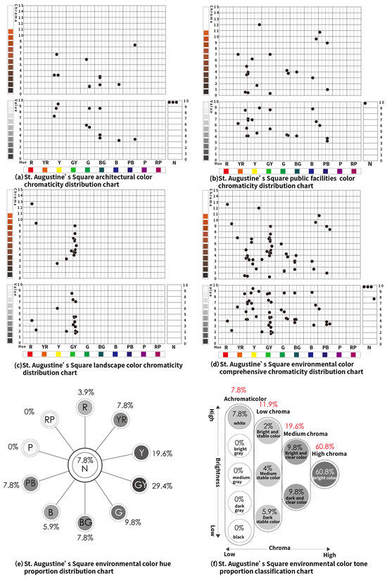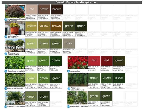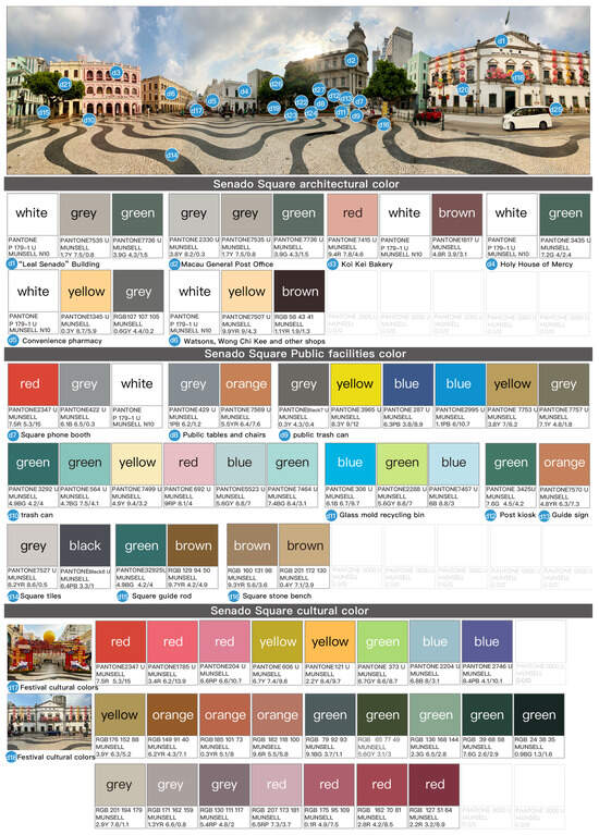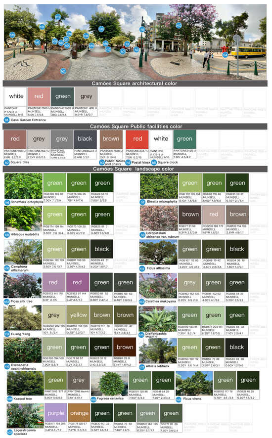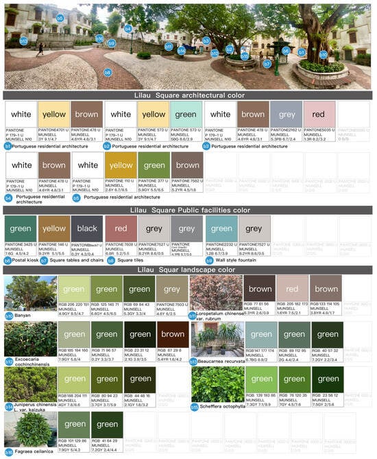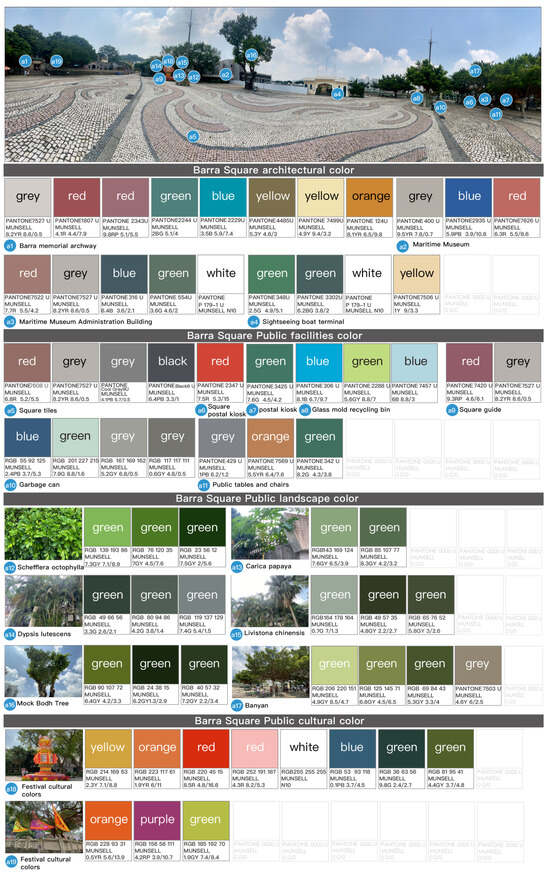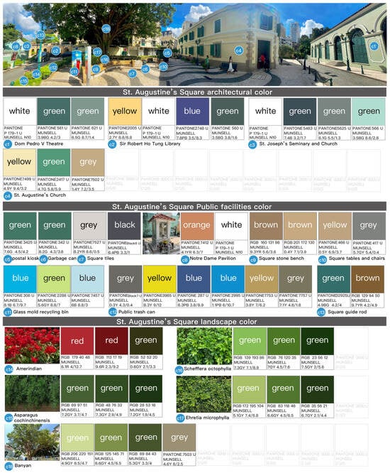 The environmental colors of St. Augustine’s Square were analyzed to include a total of 51 colors, consisting of 14 architectural colors, 21 colors for public facilities, and 16 landscape colors. The color atlas is summarized in Figure 14.
