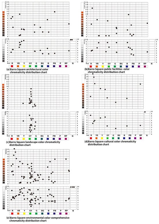 The architectural colors of Barra Square primarily include the facades of the building, prominent facade decorations, doors, and windows. The colors are mainly concentrated in R (Red), YR (Yellow–Red), Y (Yellow), G (Green), BG (Blue–Green), B (Blue), PB (Blue–Purple), and RP (Red–Purple), with YR (Yellow–Red) and Y (Yellow) being the most prevalent. This is mainly because the A-Ma Temple follows traditional Chinese temple architecture, with the overall base tone being gray, as shown in Figure 9a.