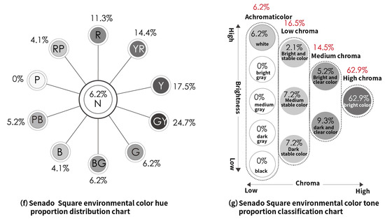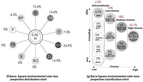Finally, the environmental colors of Barra Square are combined into a unified chromaticity chart, encompassing hues of R (Red), YR (Yellow–Red), Y (Yellow), G (Green), GY (Yellow–Green), BG (Blue–Green), B (Blue), PB (Blue–Purple), RP (Red–Purple), and N (Achromatic), as shown in Figure 9e. GY (Yellow–Green) has the largest proportion at 26.9%, followed by G (Green), YR (Yellow–Red), R (Red), PB (Blue–Purple), Y (Yellow), B (Blue), and RP (Red–Purple), with the smallest being BG (Blue–Green) at 3%, as shown in Figure 9f. The overall tone displays high chroma at 62.7%, predominantly in bright, light clear, and dark clear colors, followed by light stable, medium stable, white, and stable tones, as detailed in Figure 9g.