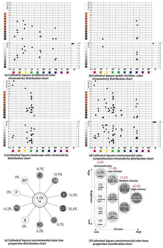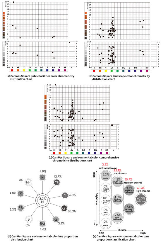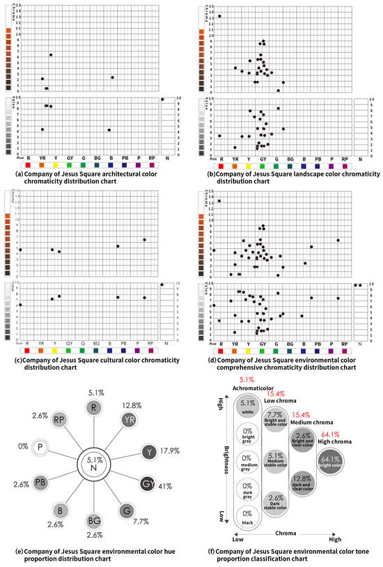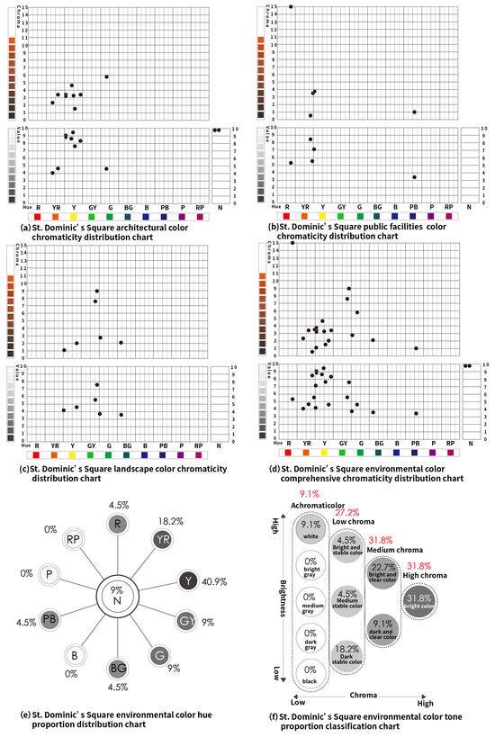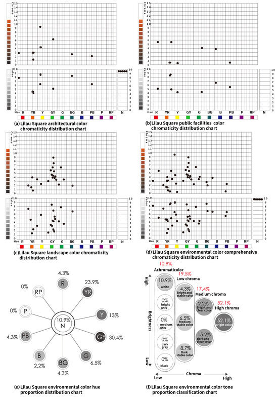 The landscape colors of Lilau Square, which mainly involve representative vegetation around the square, are concentrated in YR (Yellow–Red), Y (Yellow), G (Green), GY (Yellow–Green), and BG (Blue–Green), with GY (Yellow–Green) being the most prevalent. The tones are mostly medium chroma and dark clear, as depicted in Figure 12c. Finally, the environmental colors of Lilau Square are combined into a unified chromaticity chart, including hues of R (Red), YR (Yellow–Red), Y (Yellow), G (Green), GY (Yellow–Green), BG (Blue–Green), B (Blue), PB (Blue–Purple), and N (Achromatic), as shown in Figure 12d. GY (Yellow–Green) holds the largest proportion at 30.4%, followed by YR (Yellow–Red), Y (Yellow), N (Achromatic), R (Red), G (Green), PB (Blue–Purple), and BG (Blue–Green), with the smallest being B (Blue) at 2.2%, as illustrated in Figure 12e. The overall tone exhibits high chroma at 52.1%, predominantly in bright, dark clear, and white colors, followed by dark stable, medium stable, light stable, and light clear colors, as detailed in Figure 12f.