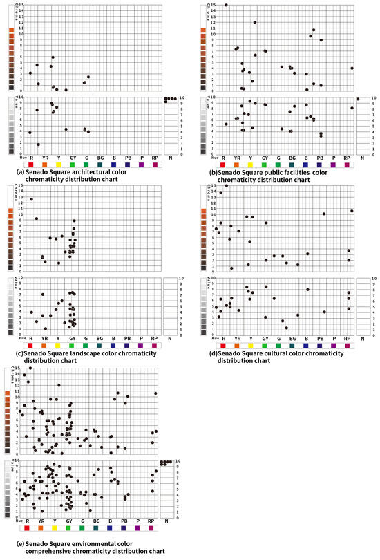 The colors of the public facilities at Lilau Square, including forecourt tiles, mail kiosks, tables, chairs, and public fountains, are mainly concentrated in R (Red), YR (Yellow–Red), Y (Yellow), G (Green), B (Blue), and PB (Blue–Purple), with YR (Yellow–Red) being the most common. The tones are mostly low chroma and medium stable, as illustrated in Figure 12b.