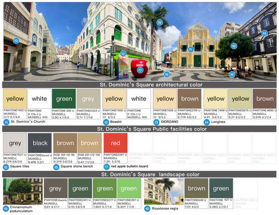 The Historic Center of Macau, as a UNESCO World Cultural Heritage site, benefits from the construction of a color system that can be integrated into urban planning and design applications. More importantly, it provides a color system that helps to better preserve the unique characteristics of the historic district. Through the extraction and analysis of architectural colors and the environmental colors of the squares within the Historic Center of Macau, this study compiled a comprehensive color spectrum of the buildings, individual color spectrums for each square, and an overall color spectrum for the entire historic district, thereby constructing a color system for the Historic Center of Macau. Based on the distribution of color information, 60 representative colors were identified. It was found that the color composition and expression of the 8 squares in the Historic Center of Macau differ significantly, with Senado Square having the most colors, a total of 97, which is closely related to its extensive commercial and cultural exchanges. The most common material carriers of color are landscape and architectural colors, with GY (Yellow–Green) being the most frequent. Furthermore, the origin of each square’s colors is linked to the area’s function, population, and cultural memory. For example, Barra Square, home to the A-Ma Temple, reflects the characteristics of traditional Chinese religious and folk culture, Lilau Square presents scenes of Portuguese life in the past, and the Company of Jesus Square bears witness to the spread of Western Catholic culture in the East. These color systems of the squares provide insight into the formation of local culture. In conclusion, by conducting field surveys and recording color information, it is possible to construct an urban color system that can be applied to urban planning and design, while also interpreting cultural meanings through color.
