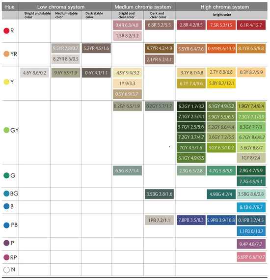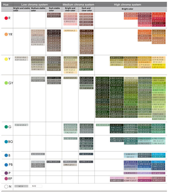 After establishing the color database, this study utilized the Munsell color chart to obtain the color chroma distribution of survey data. Subsequently, the survey data were categorized by the proportion of hues, using a hue proportion chart to determine the distribution of hues. The “Kumamoto Color Guide—Landscape Color Guidance Manual” [33] classifies all colors into four levels of chroma: achromatic, low chroma, medium chroma, and high chroma. Based on specific requirements, this study modified this classification into 11 types of tones (bright stable, medium stable, dark stable, bright clear, dark clear, bright, white, bright grey, medium grey, dark grey, and black).