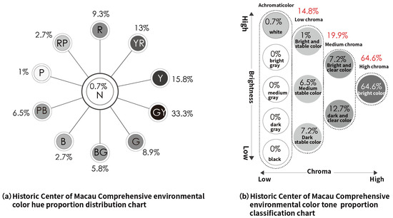 Proportion distribution of hue and tone classification for the comprehensive environmental colors in the Historic Center of Macau.
