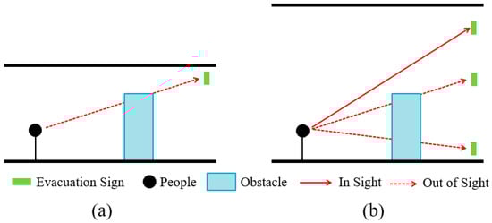 Visual relation between an evacuation sign, an obstacle, and a person. (a) In a building space with low ceilings, the evacuation sign is obstructed by the obstacle; (b) In a large space building, the evacuation sign at high-location can avoid being obstructed by the obstacle.