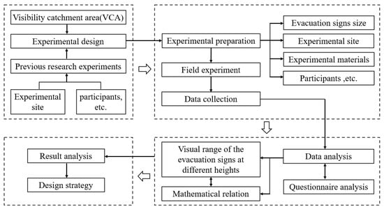 In this paper, firstly, the VCA concept is introduced, and participants are recruited to conduct experiments to observe and measure the viewing distance of evacuation signs recognized by a single person under different height and angle settings. Then, this study utilizes statistical methods to obtain a mathematical model for the relation between the height and visual range of evacuation signs, so as to quantify the viewing distance of people to the signs under different heights setting of evacuation signs. Finally, in view of the impact of changes in the height of evacuation signs on their visibility, it is proposed to create a smart safety design for evacuation signs based on height changes without changing their architectural features, in order to improve fire safety and evacuation efficiency of large space buildings. The rest of this paper is organized as follows. Section 2 describes the experimental setup and process in detail. The experimental results are analyzed in Section 3. Finally, Section 4, Section 5 and Section 6 are devoted to the discussion of experimental results, application of design strategies, conclusion, limitation, and future work, respectively (Figure 2).