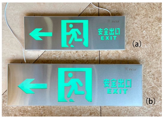 In this experiment, evacuation signs that meet the requirements of the Chinese building code standards (Technical standard for fire emergency lighting and evacuate indicating system, GB 51309-2018) and are used in large space buildings are selected, namely, evacuation sign A and evacuation sign B (Figure 3). Evacuation signs were produced by Zhejiang Taiyi Fire Holdings Co., Ltd., Zhejiang, China and the material and brightness of the signs met the code requirements (Table 1).