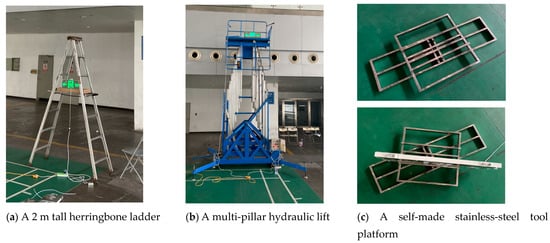 A 2 m tall herringbone ladder and a multi-pillar hydraulic lift (with a lifting height of 2 to 18 m) manufactured by the Chongqing Minghua Machinery Co., Ltd., Chongqing, China, were used for the height adjustments in the experiment. The evacuation signs were placed on a self-made stainless-steel tool platform that could perform a 360° free rotation to meet the requirement of the different horizontal offset angles in the experiment (Figure 4).