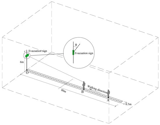 With continuous urbanization and rapid economic development, the public demand for quality of life and the use of space is increasing. To meet people’s needs for complex building functions, an increasing number of large space buildings, such as exhibition halls, stadiums, airport terminals, and railway stations, have been constructed []. Large space buildings are characterized by high ceilings, large areas, large space capacity, and large numbers of people. When a large number of people gather in a building space, evacuation signs play a key role in the safety of people in case of emergencies such as fires and earthquakes []. The reasonable setting of evacuation signs can guide evacuation to safety exits (areas) quickly, reduce the wayfinding time in a complex space, and thus improve the evacuation efficiency of people [].