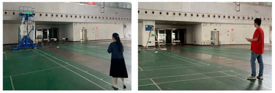 Walking is the primary evacuation behavior [,], the eye height of the participants while standing was used as the benchmark. At the same time, in order to control the variables and avoid the influence of height differences between males and females on the experiment, this research chose to set the eye height of people to a fixed value. Based on the adult height standard in Human Dimensions of Chinese Adults (GB 10000-1988) and the data on people’s eye height in previous studies (1.6–1.75 m) [,,,], the eye height of the participants was set to 1.70 m, and the eye height was adjusted by increasing or decreasing the thickness of the shoe sole.
