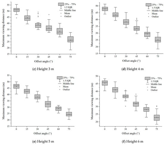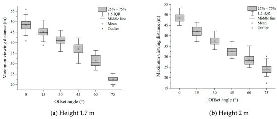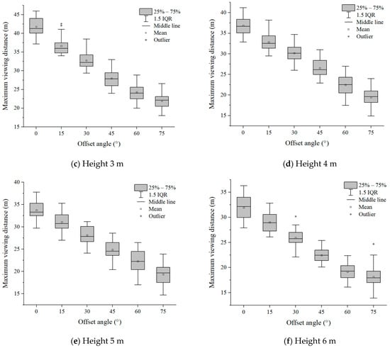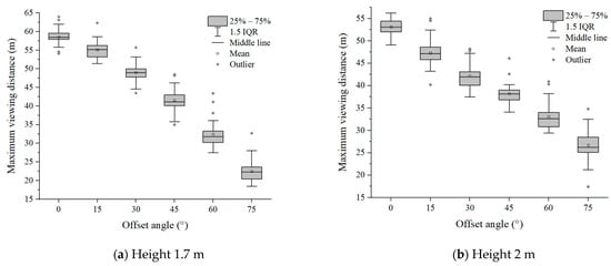 Six groups of experimental data with evacuation signs A and B between 1.7 m–6 m were analyzed, respectively. It can be seen from Figure 7 and Figure 8 that in the range of the offset angle from 0–75°, as the offset angle became larger, the viewing distance became shorter. This is because the offset angle of evacuation signs gradually becomes larger, and finally it is parallel to the line of sight of participants, which makes it difficult for participants to recognize the evacuation signs. This result was consistent with the findings of Xie et al. []. In addition, the same sign was at the same offset angle, and its maximum viewing distance was different when the setting height was different (Table 2 and Table 3). This is a new discovery, and the relationship between the setting height of evacuation signs and the viewing distance had not been paid attention to in the previous research.