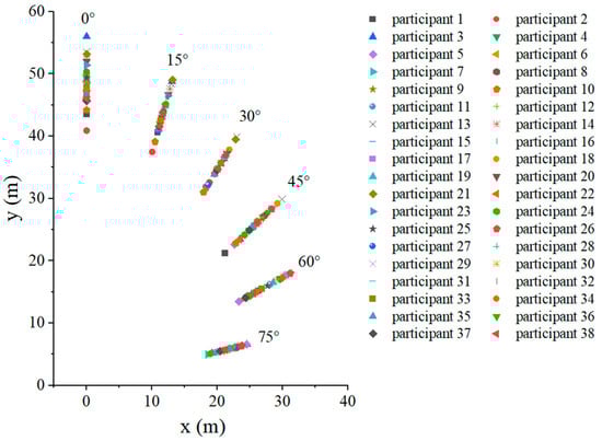 By using the data processing of the evacuation sign A at a height of 1.7 m as an example, obtain the visual range of the evacuation signs (Figure 9). When the offset angle was in the range of 0–90°, and the visual range of the evacuation signs was approximately half an ellipse. Furthermore, the average and standard deviation of the maximum viewing distances of the evacuation sign A at a height of 1.7 m under six offset angles was obtained (Table 4).