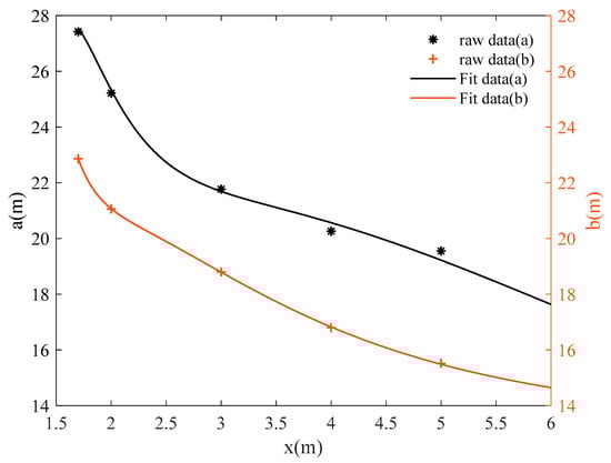 Curve fitting of the semi-major and minor axes, a and b, of the visual range of evacuation sign B with height z.
