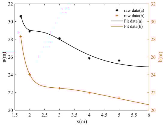 According to Equation (1), the factors affecting the visual range of the evacuation signs are the semi-major and minor axes, a and b, of the ellipse. Figure 11 and Figure 12 describe the relation between the visual range axes a and b and the height z of evacuation signs A and B, respectively. Through multiple linear regression analysis, considering the monotonic decrease of a and b with respect to z and the steep degree of change. According to Occam’s Razor, Ockham’s Razor, the model should be simplified as much as possible. Therefore, this research set the fitting model as a polynomial model of about 1/z, which is essentially a simple linear model.