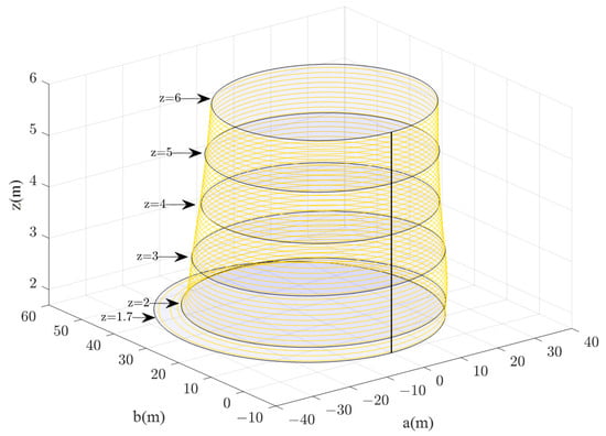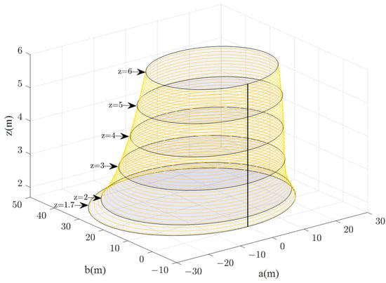 On this basis, according to Equations (5) and (6), the 3D diagrams of the visual range of evacuation signs A and B with heights of 1.7–6 m were obtained (Figure 13 and Figure 14). The researcher can clearly get the area of the visual range of evacuation signs A and B with different heights of 1.7–6 m and can also understand the changes between the visual range areas of evacuation signs and the height setting.