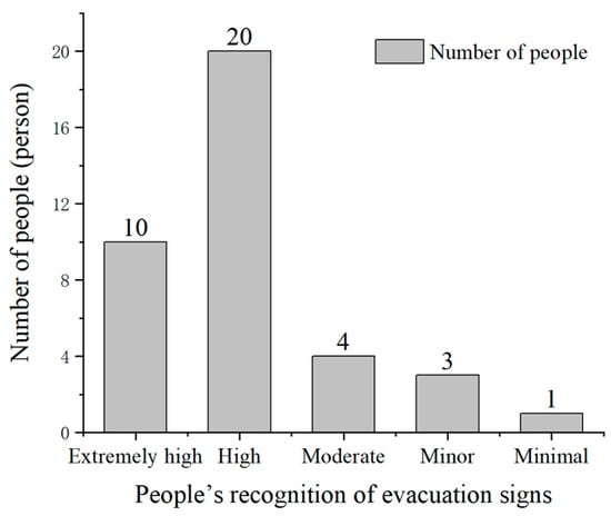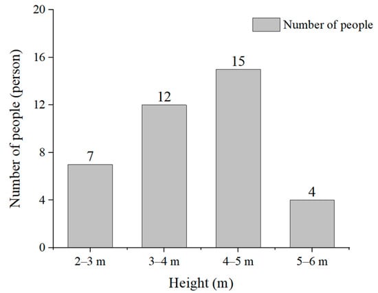 Regarding the factors that did affect sign recognition, the influence of the height of the evacuation signs on sign recognition distance was considered extremely high, high, moderate, minor, and minimal by 10 (26.32%), 20 (52.63%), 4 (10.53%), 3 (7.89%), and 1 (2.63%) participants, respectively (Figure 15). Therefore, greater than 75% of the participants noted that the height of evacuation signs had an impact on the visual range of the participants’ recognition. In addition, the participants’ selection of evacuation sign height tended to be between 3 and 5 m, accounting for 70% of the total number of participants, which agreed more with the visual habits of the participants (Figure 16).