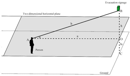 When the eye height of a person is the same as the height of the evacuation sign (i.e., h = 0), b = a. The angle, α, between the human eye and the sign increases with an increase in h, that is, when the height, h, of the sign increases, the viewing distance, a, between a person, and the sign gradually decreases, thereby reducing its visual range. However, in actual application and research, the maximum viewing distance, a, between a person and an evacuation sign is set to a fixed value, which is not in agreement with the actual situation.