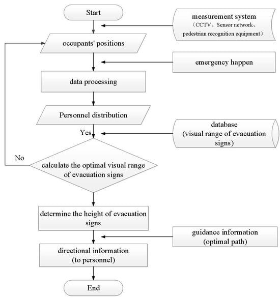 The entire device system includes two stages. In the first stage, evacuation signs and measurement facilities (CCTV cameras, pedestrian recognition equipment, and sensor networks) will be installed in the same spatial area to grasp the characteristics of people []. And, the data are transmitted to the control center for processing to obtain the distribution of people in the building (the visual distance between a single person or the main guide of a group of people and the evacuation sign). Only the situation of people who are about to reach the boundary of the visible range of evacuation signs is analyzed to attract their attention to the signs, and they will continue to observe the evacuation signs in other locations and finally evacuate to the safety exit. In the second stage, after the emergency evacuation information is received, people are provided with the optimal evacuation route obtained by using intelligent algorithms [,]. By combining the distribution of people and the database of visual ranges of evacuation signs at different heights (e.g., Equations (5) and (6)), the evacuation signs are adjusted to the optimal heights in time through the control center.