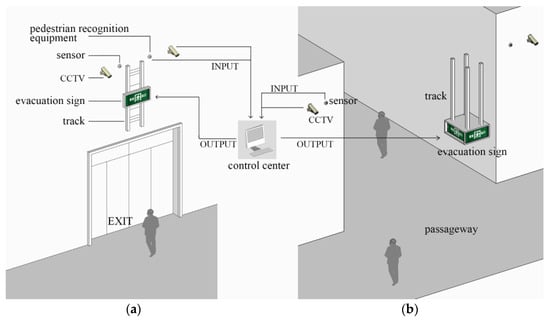 Schematic diagram of the application scenario for the smart device for the evacuation sign height adjustment. (a) safety exit; (b) interior intersection of a large space building.