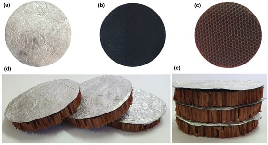 Membrane and honeycomb structure. (a) Membrane based on recycled material, aluminum film side; (b) Membrane based on recycled material, fabric side; (c) honeycomb structure; (d) Three groups of couple membrane-honeycomb; (e) Sandwich sample with three groups of couple membrane-honeycomb stacked.