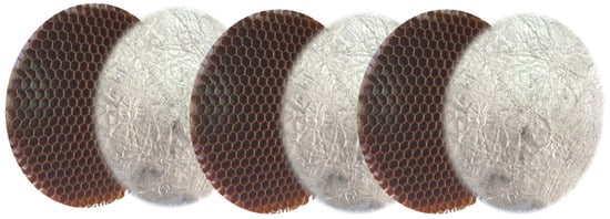 The core of a sandwich panel is typically composed of lightweight, low-density materials such as polymer foams, expanded polystyrene, wood, cardboard, or honeycomb materials. This core contributes to the panel’s lightness and imparts specific thermal, acoustic, and structural properties, depending on the material used. A honeycomb core, inspired by natural bee honeycombs [], provides a balance of lightness and mechanical strength through its hexagonal or polygonal cell arrangement (Figure 1c). This structure is known for its high compressive strength and minimal material use and can be enhanced with insulating materials to improve thermal and acoustic insulation in buildings or vehicles []. Table 1 shows the physical properties of the materials used for the preparation of the specimens.