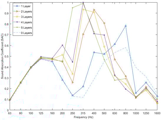 When switching to the configuration with five membrane layers, the SAC peak shifts dramatically towards around 315 Hz, with values close to 1. This shift and increase in the peak can be justified by the fact that each additional membrane layer introduces further resonance mechanisms. These additional layers amplify the absorption of sound waves, especially at lower frequencies, where the cavities behind the membranes create optimal conditions for resonance. The observed behavior can also be explained by considering the physics of acoustic resonance. Each membrane layer adds a resonant element to the system, which interacts with the incident sound waves. The membranes vibrate at specific frequencies, absorbing sound energy and converting it into heat. The cavities behind the membranes amplify this effect, creating a system of multiple resonances that maximizes acoustic absorption.