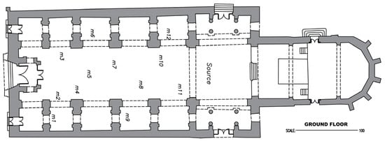Meeting the criterion of the standard, two groups of on-site measurements were conducted, each one with two sound sources, and 12 microphone locations. Since the prior is normally in the same location, the two sound sources were placed in the central room of the transept. The main dimensions of the church are shown in Table 5.