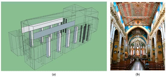 The church of Santo Domingo in Quito, Ecuador, with an estimated volume of 15,680 m3 was chosen to simulate the acoustic behavior of the metamaterial. On-site acoustic measurements were carried out to calibrate the simulations calculated in ODEON. The procedure followed complied with the ISO 3382-1:2009 []. The sound sources and receivers’ locations used for the ODEON simulation coincided with the ones in which the sound sources and sound level meters respectively were located during the on-site acoustic measurements.