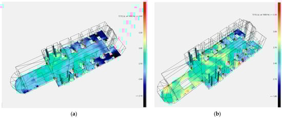 (a) T(15) results of the initial Odeon church model. (b) T15 results of the Odeon church model with the metamaterial 5 L covering the upper parts of the walls near the vault in the main nave, as well as the front and back faces of the side aisle columns.