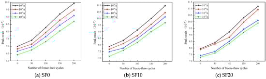 Figure 7, the specimens exhibit an increase in axial peak strain with F–T cycles rising. For instance, considering a strain rate of 10