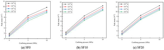 Figure 8 show that higher strain rates result in a reduction of the maximum axial strain in concrete samples after 100 F–T cycles. In the absence of steel fiber reinforcement (SF0) and under 0 MPa confining pressure, the axial peak strain reduces by 4.4%, 8.0%, and 10.6% at strain rates of 10