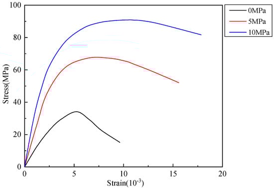 −5/s under different levels of confining pressure. As the pressure increases, the slope of the curve in the elastic phase steadily increases, making the compaction phase of the stress–strain curve more noticeable. Additionally, the energy absorption capacity of the specimens increases with higher confining pressure. The enhancement in concrete properties is due to the constraining impact of pressure on crack formation, leading to improved strength and overall characteristics.