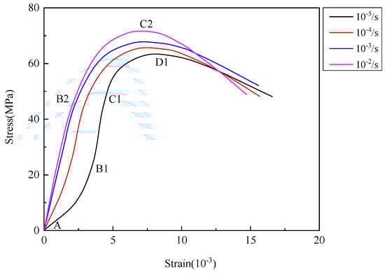−5/s that is nearly constant, the process of deformation can be categorized into four phases: compaction of pores (AB1), elasticity (B1C1), cracking that is not stable (C1D1), and then failure. The AB1 stage involves the closure of concrete pores during the initial loading stage, resulting in an upward concave shape. With an increase in strain rate, the beginning portion of the stress–strain graph tends to become more linear. At a strain rate of 10