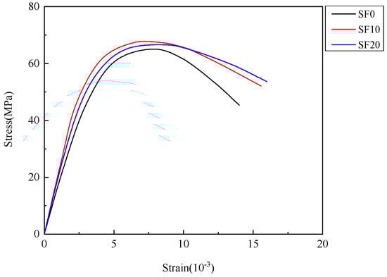 Figure 10 shows the stress–strain behavior of SF10 concrete samples after undergoing 100 cycles of freezing and thawing at a strain rate of 10