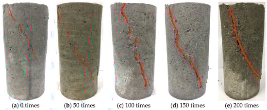 Figure 13, surface damage increases with more F–T cycles, with more severe surface slag observed. Triaxial compression tests reveal subtle cracks in the absence of F–T cycles. After 50 cycles, loose mortar and detachment appear at the cracks. With more cycles, this damage worsens. After 200 cycles, the main crack widens significantly, with considerable loose mortar. Even with more F–T cycles, the angle between the crack surface and the horizontal plane stays constant, suggesting that the basic failure mode persists, but F–T cycles lead to larger and more visible cracks as internal damage accelerates.