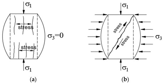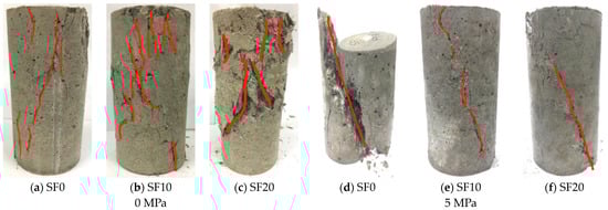 Figure 15a,d, during triaxial compression, the confining pressure inhibits the formation of vertical cracks, leading to characteristic oblique shear failure, consistent with previous studies [