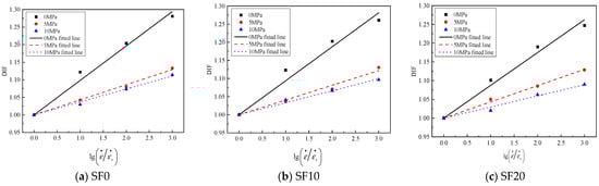 33], who observed a nonlinear growth relationship between the dynamic increase factor of concrete strength and the strain rate. The variation in these results may be due to different experimental conditions, particularly the saturation of the concrete samples. Before applying mechanical stress, the concrete specimens were fully soaked with water, potentially impacting the correlation between strain rate and DIF. The presence of water within the pores of the concrete can modify its mechanical behavior, especially under dynamic loading scenarios. Moreover, as the confining pressure on the concrete increases, its sensitivity to strain rate also heightens [
