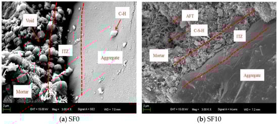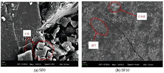 Figure 19a. In stark contrast, the SF10 matrix demonstrates a markedly different microstructure. It contains relatively larger amounts of AFT and C-S-H, with only a minimal presence of C-H, which is predominantly distributed around the AFT phases, as shown in