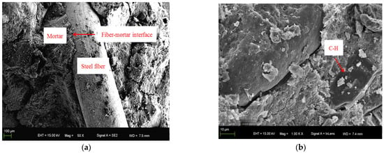 Figure 19b. This configuration results in a more compact and dense structure. Adding steel fibers to the concrete mix is essential for increasing its density and enhancing the overall structure of the concrete. Bridging serves to evenly distribute stress within the matrix and halt crack propagation, ultimately improving the strength and deformation characteristics of concrete.