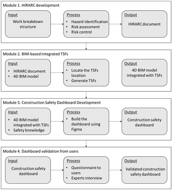 Figure 1 shows the framework of developing a construction safety dashboard. Following this framework is required to develop a construction safety dashboard which contains a comprehensive workspace planning of TSFs in the 4D BIM model. The framework consists of four modules: (1) HIRARC (hazard identification, risk assessment, and risk control) development to address hazard identification, risk assessment, and risk control to work activities, (2) BIM-based workspace planning for TSFs application, (3) construction safety dashboard development, and (4) dashboard validation from users. Each module is described in the form of input–process–output. A detailed explanation of each module is explained in the following subchapters.