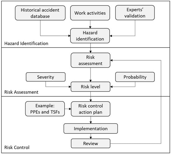In the first module, HIRARC development is conducted. HIRARC, an acronym of hazard identification, risk assessment, and risk control, is a systematic approach of risk management which is commonly used for construction projects in Indonesia. The government of Indonesia has enacted the Regulation of Ministry of Public Works No. 10 of 2021 to guide HIRARC’s implementation [25]. HIRARC has been implemented mostly in Indonesia and Malaysia [26,27,28]. The workflow of HIRARC is shown in Figure 2. HIRARC starts with hazards’ identification, which is a process used to determine the potential hazards related to working activity that may cause harms to workers, materials, tools, or systems [26]. The risk assessment involves evaluating the risk levels of these identified hazards, considering their likelihood and potential severity [27]. Risk identification and assessment are conducted based on the historical accident database and experts’ validations.