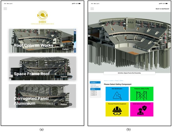 The content of the dashboard: (a) front page; (b) safety knowledge page of chosen work activity.