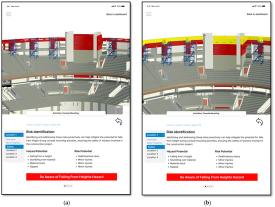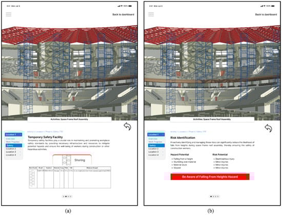 The safety knowledge is divided into “risk identification”, “temporary safety facilities”, “personal protective equipment”, and “safety work instruction”. For example, when the users click the “temporary safety facilities” button, the dashboard will go to the next page dedicated to showing the 4D BIM model integrated with TSFs and detailed specifications of the temporary safety facilities, as shown in Figure 4a. Another example, when users click the “risk identification” button, the dashboard will go to the next page dedicated to showing the list of risks that were identified in the HIRARC document, as shown in Figure 4b.